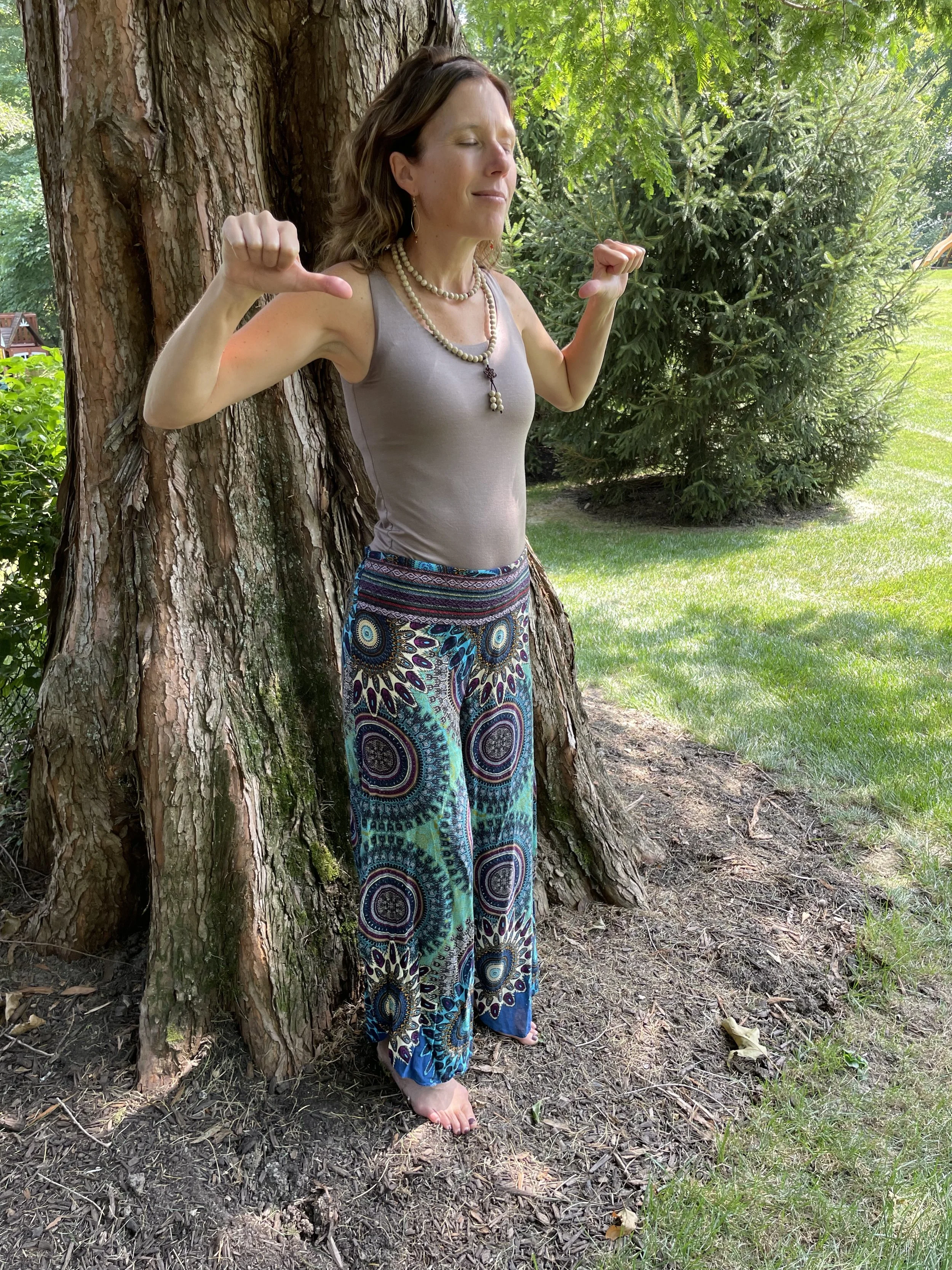 Begin by standing with your feet hip distance apart. Raise the hands to chest level and point your thumbs at each other in a loose fist. Draw your hands back to the chest, maintaining the position. Now, allow the elbows to relax so that it also relaxes the shoulders and neck. Not horizontal and not dropped fully to the sides. Feel that sweet spot in between. Bend your knees slightly and close your eyes. You can practice with or without music/meditation and in or outdoors. Allow your breathing to be natural. If balance is an issue you can open your eyes or stand against a wall or a piece of furniture.